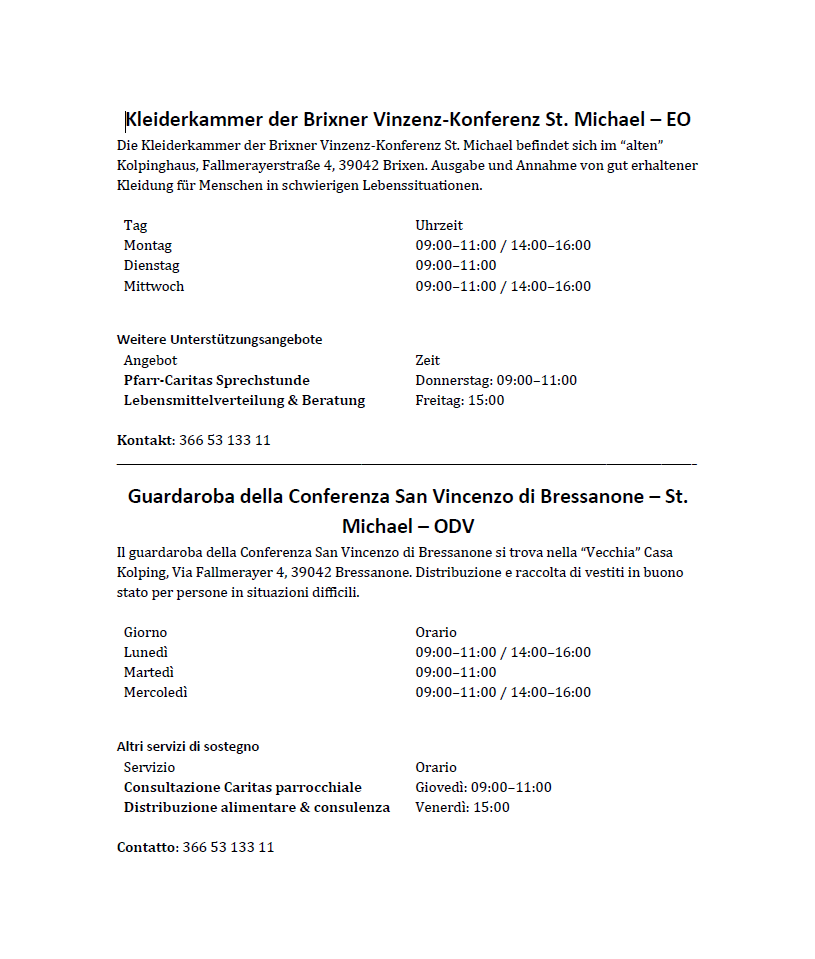 Kleiderkammer Vinzenzverein: Informationen / Guardaroba Conferenza S. Vincenzo: Informazioni